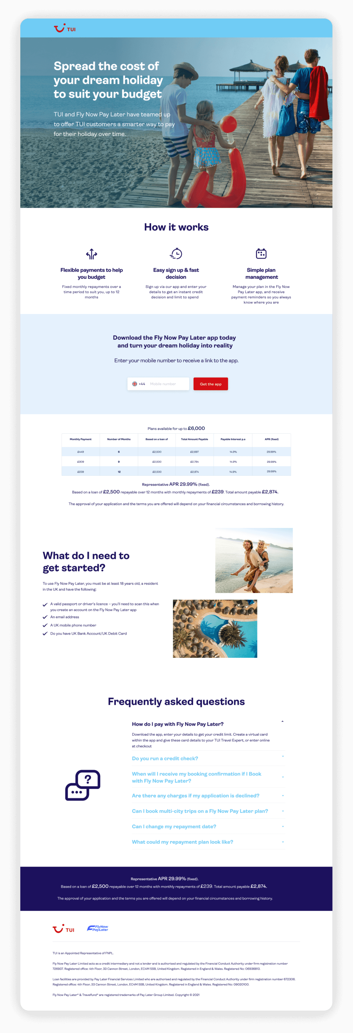 Fly Now Pay Later recently announced a new partnership with TUI, a leading travel company, to provide TUI customers with a more innovative way to pay for their vacations in instalments. As part of this project, I assisted in the design of the user flow to allow customers to easily complete their payments on the website channel.